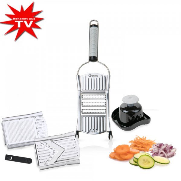 С рендето безпроблемно ще нарежете и накълцате всякакви плодове, зеленчуци, подправки и др. Модела е изцяло изработен от неръждаема стомана, подходяща за хранителни продукти. С приставката за зеленaчуци можете да нарежете всички съставки за приготвянето на супи, салата, ястия и още много други. Безпроблемно режете на филийки, жулиени, кубчета, фино настъргване и други. Освен това в комплекта ще откриете и практичен контейнер за съхранение на съставките.