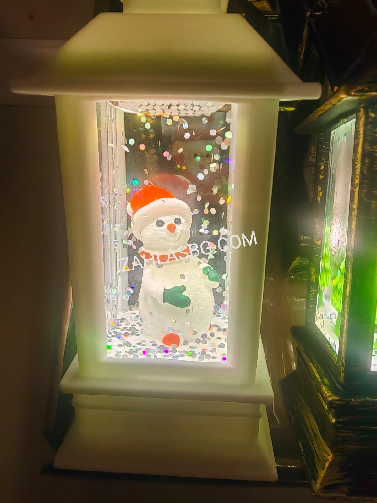 Малък светещ коледен фенер с приказна фигура във вътрешната си част и падащи снежинки около нея. Може да се закачи на всякъде и да се превърне в приказна висяща коледна украса. Вътре във фенерът има лед лампичка, която свети в много мека светлина. Работи с 3 броя AG13 батерии, които са включени в комплекта. Преспапиетата се предлагат без картонена кутийка.