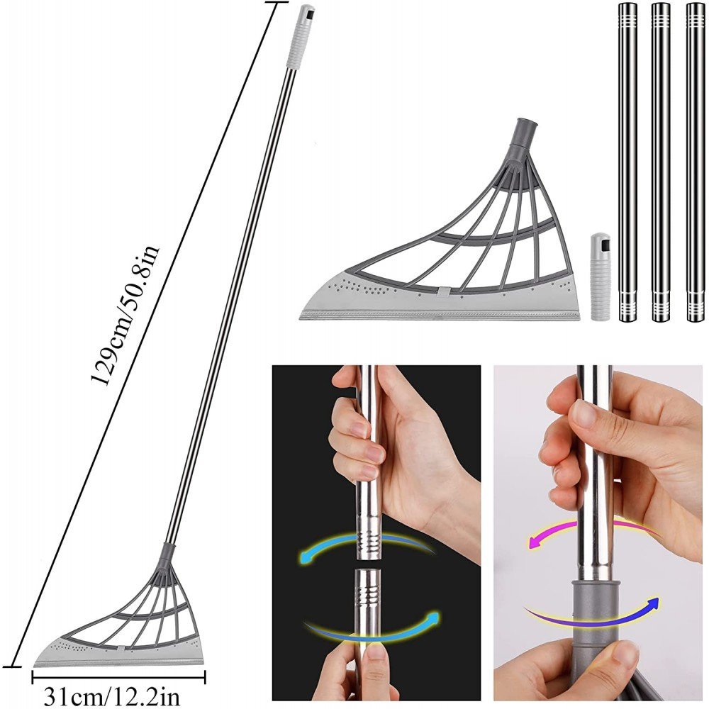Метлата е оборудвана с двулицева силиконова глава, която осигурява ефективно почистване както на сухи, така и на мокри повърхности. Ергономичната дръжка с удобен захват осигурява комфорт по време на работа и разполага с отвор за закачане, което улеснява съхранението. Компактният дизайн прави уреда лесен за използване и пренасяне.