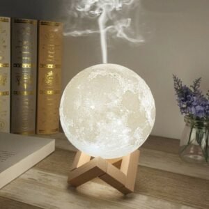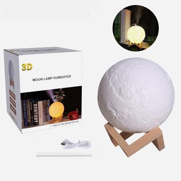 Нощна лампа тип дифузер и овлажнител свети в 3 цвята. С реалистичната си 3D форма копира истинския релеф на Луната, и лампата преминава през всички нейни фази с 3 сменящи се режима на светене чрез докосване. Светлината и е мека и ненатрапчива. Осигурява приятна, успокояваща атмосфера.