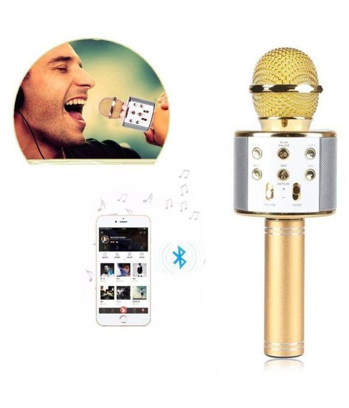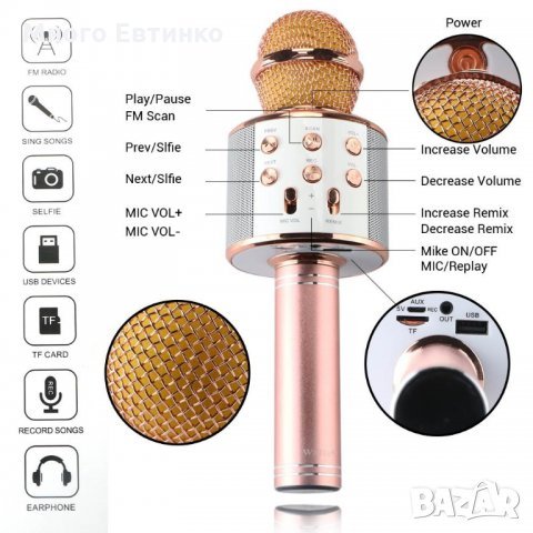 Безжичният блутут караоке микрофон с вграден говорител представлява комбинация от микрофон и говорител, свързващи се с всяко устройство с блутут – мобилен телефон, таблет, компютър и други. Така имате всичко, което ви е нужно – музика, микрофон и спийкър, от който се чува вашето изпълнение. Този модел има и вграден USb вход за възпроизвеждане на музика от флашка. Идеален за всяко парти; Безжично свързване с устройства; Удобна форма; Разполага с микрофон и говорител в едно; Стилна визия; Разполага с потенциометър за силата за звука на микрофона и потенциометър за ехо-ефекти.