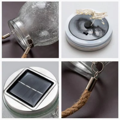 Аморфен соларен панел захранва батерията от слънцето през деня и бурканът се включва автоматично при здрач. Акумулаторната батерия се съхранява дискретно с бутон за включване / изключване в капака на буркана.