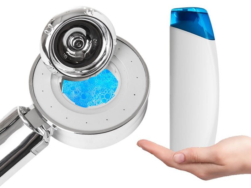 От едната страна слушалката разпръсква вода, а от другата – сапунена пяна ( необходимо е само да заредите пълнителя с любимият си душ гел, или шампоан)