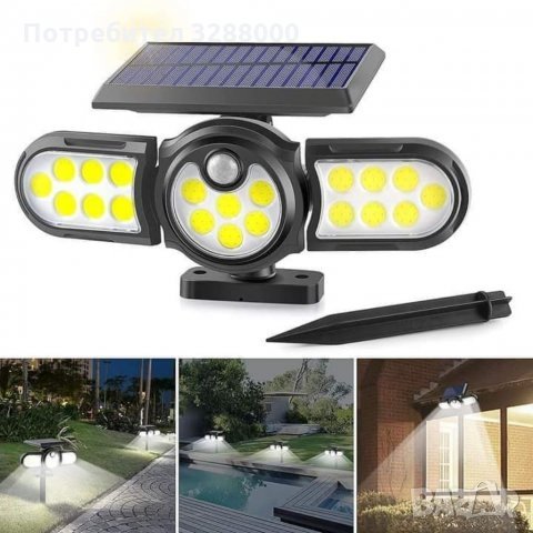 Регулируема лампа със соларен панел и сензор за движение, с помощта на която ще можете да осветите голям периметър. Лампата се презарежда от слънчевата светлина и използва запазената мощност за нощно осветление. С иновативния си дизайн лампата има широко регулируема осветителна зона, благодарение на трите глави, които можете лесно да местите по хоризонтала и вертикала за постигане на широк ъгъл на осветяване до 270°. Соларният панел и лампата са проектирани като едно тяло.
