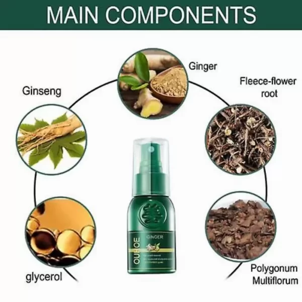 Състав на продукта: вода, екстракт от джинджифил, екстракт от корен на Polygonum multiflorum, екстракт от корен на ангелика, екстракт от листа на Platycladus orientalis, пропилен гликол, екстракт от морски зърнастец, пиридоксин, аромат и др.
