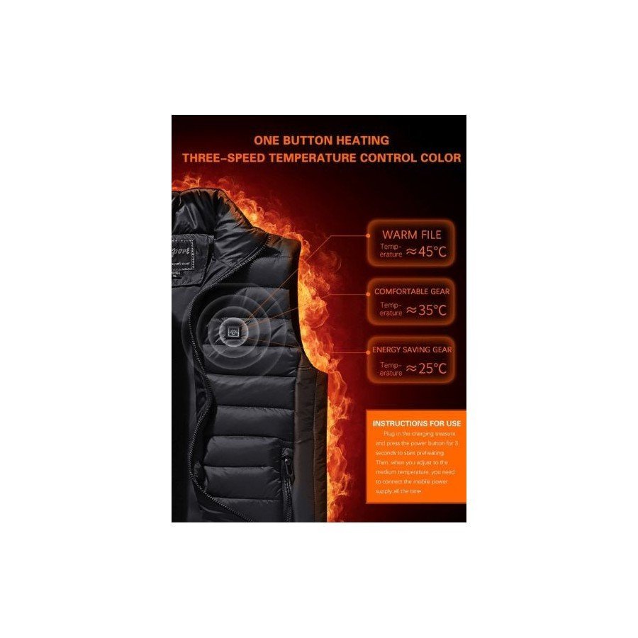 FLAMEVEST е топъл и пухкав елек  Има LED индикатор, който само с едно натискане, може да регулира температурата на топлината в три нива и да поддържа желаната от теб топлина. Жилетката има допълнителен удебелен памучен слой, който задържа топлината през целия ден Ако работиш в офис и ти е студено на работа винаги можеш да облечеш тази, топла и елегантна жилетка. Ако си любител на зимните спортове, като планинско катерене, каране на ски или риболов, то тази жилетка е нещото, от което се нуждаеш.
